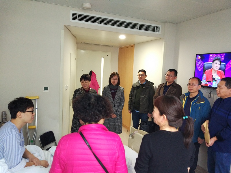 在病床前,领导老师详细询问了孙晓翔目前的治疗和康复情况,鼓励他要乐观坚强,树立战胜病魔的信心,积极配合医院的各项治疗,争取早日康复。同时,也向其父母了解了目前生活面临的困难,并表示公司会尽最大的努力帮助他完成治疗。孙晓翔及家人对公司师生的关怀表达了由衷地感激,一再表示孩子能在这样的集体中学习生活,家长们放心,一定好好给孩子治疗,让晓翔早日康复重返校园。孙晓翔同学也表示自己会乐观的面对以后的生活,积极的配合治疗,争取早日回到校园读书。
