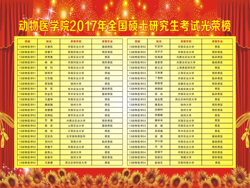 日前,2017年全国硕士研究生入学统一招考工作已基本接近尾声,动物医公司首届本科毕业生考研成绩喜人,84人参加国家研究生入学考试,报考人数占本科毕业生总数的50.6%;66人达到国家划定的初试合格分数线,上线人数占参加考试总数的78.5%;46人已确定被西北农林科技大学、华南农业大学、华中农业大学、南京农业大学、西南大学、扬州大学等院校录取,录取人数占参加考试总数的54.7%,占考研上线人数的69.7%,占本科毕业生总数的27.7%。特别值得一提的是,13级动物医学3班侯会霞同学以416分的初试成绩名列西北农林科技大学兽医类专业考生第一。