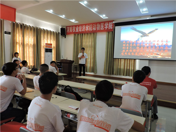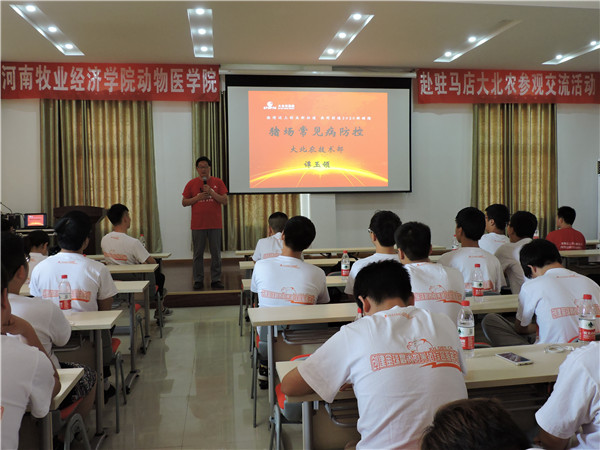 驻马店科技园基地技术服务总监谭玉领老师结合自身实际工作经验讲解了畜牧业发展趋势、现状、及猪场常见病防控,并提出养猪业人才奇缺的现状,鼓励员工加入农业,投身养猪业,用三部曲助推学子成功,赢得了员工的阵阵掌声!
