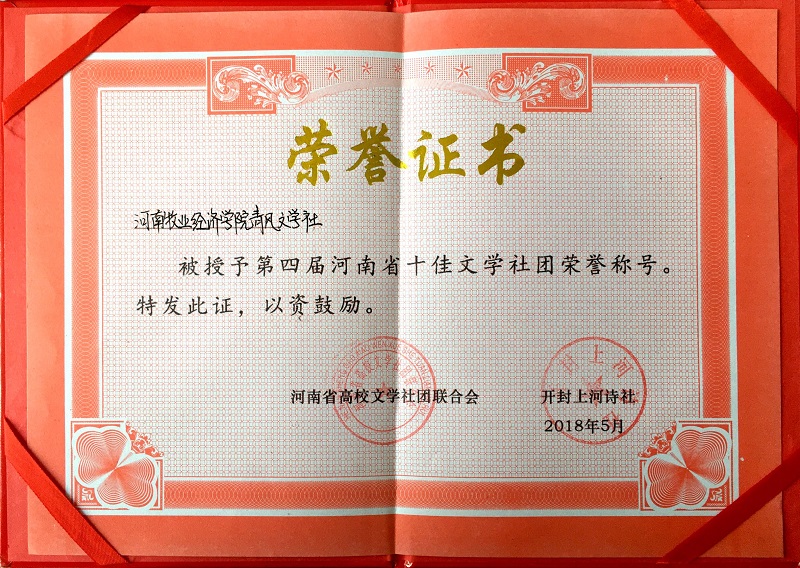 近日,第四届河南省高校文学社团交流峰会在开封河南大学金明校区顺利举办,来自河南省各地区的200多名高校文学社团代表参加了此次交流会,会上评选了“2018年度河南省十佳文学社团”、“二十二优秀社团”、“河南高校文联优秀干部和优秀会员”等,英国365集团青风文学社作为参会代表之一,荣获“第四届河南省十佳文学社团”荣誉称号。