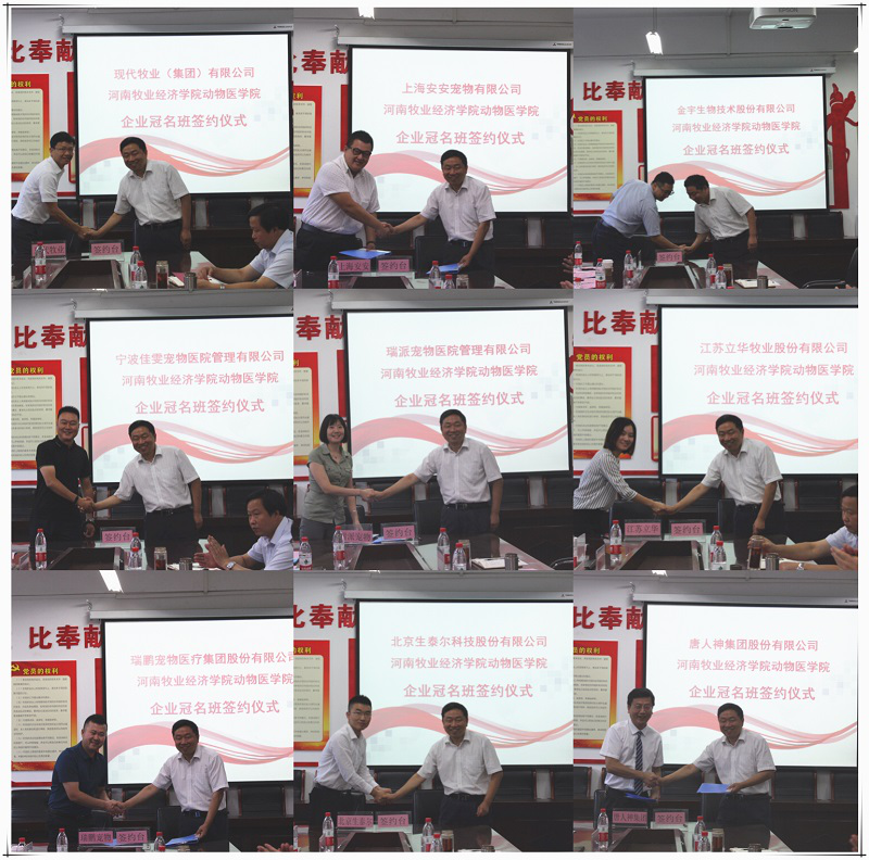 9月11日上午,英国365集团在生工楼C401会议室举行2018级企业冠名班签约仪式。董事长罗士喜,教务处处长、公司经理边传周,公司党总支书记王春明,河南省猪病防控工程技术中心主任李文刚,副经理石冬梅、党总支副书记张瑞春和来自金宇生物技术股份有限公司、唐人神集团股份有限公司、瑞派宠物医院管理有限公司、北京生泰尔科技股份有限公司、瑞鹏宠物医疗集团股份有限公司、上海安安宠物有限公司、江苏立华牧业股份有限公司、现代牧业(集团)有限公司、宁波佳雯宠物医院管理有限公司等9家企业的负责人出席签约仪式。签约仪式由公司党总支书记王春明主持。