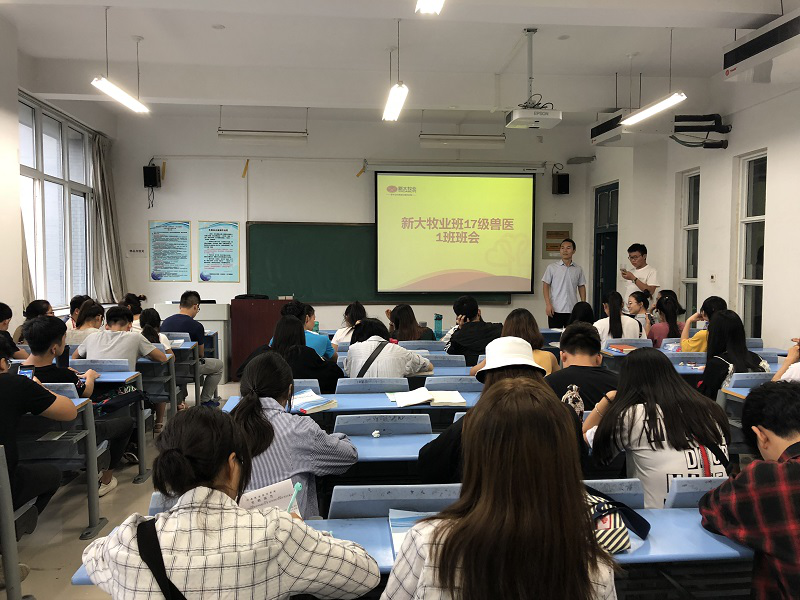 9月14日,2016级“新大牧业班”和2017级“新大牧业班”全体同学分别于生工楼C405、A412举行新学期主题班会,冠名企业河南省新大牧业股份有限公司负责人及校企双方班主任参加。