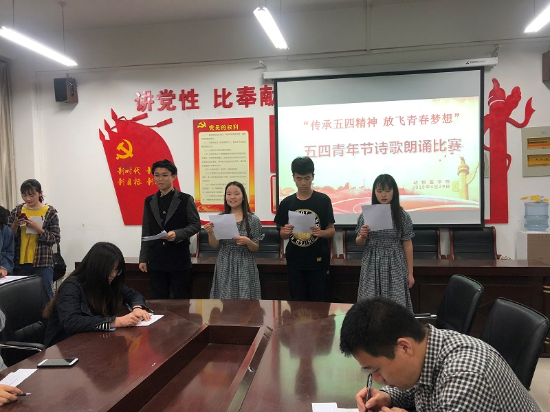 本次诗歌朗诵主题为弘扬五四精神,放飞激情,讴歌伟大时代,畅想美好未来。经过初赛26组比拼,角逐出本次决赛的九组选手,参赛者在选题中结合自己对五四精神和伟大祖国的所见、所闻、所感、所思,选取适合的朗诵篇章及背景音乐或背景视频,整体效果庄严而不失热情。朗诵选手台风稳健,着装、仪表端庄,举止自然大方,根据朗诵内容或豪迈奔放,或沉稳优雅,或激昂慷慨,或沉雄低回,充分体现了公司员工朝气蓬勃,昂扬奋进的精神面貌,使台下的评委和观众深受感染。经过一个多小时的角逐,根据在场评委公平公正的评分,其中18动检班黄紫薇和李岩组凭借《五四铭诗》的激情朗诵荣获一等奖,18动医02班丁建强《我的中国心》和17兽医01班李江鹏《沁园春·长沙》 荣获二等奖。刘思焱、张仓宁、董艺源、乔钧培获得此次活动的三等奖。最后,公司团总支书记王宏魁老师就本次五四诗歌朗诵比赛做出总结点评,他指出选手朗诵时语言清晰、响亮、富有丰富感情,同时也将现场的气氛一次次推向高潮。希望同学们能够铭记历史,学习和传承“五四”爱国精神,就要从身边的事做起,用自己的行动,为中国特色社会主义的发展贡献一份力量。