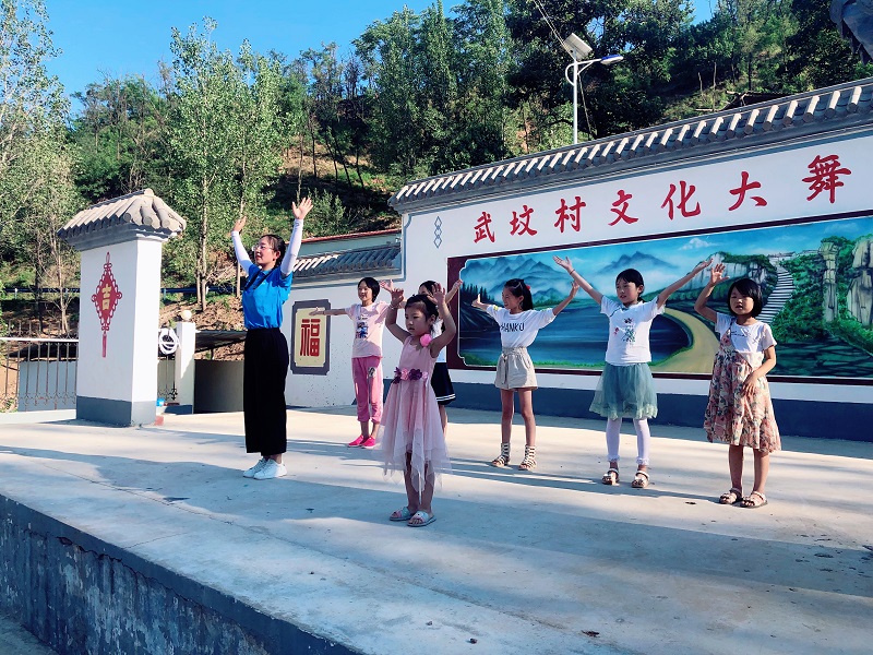 7月4日下午17:00,公司“知与行”暑期社会实践小分队在武坟村文化大舞台上教小朋友们学习儿童舞蹈《天天向上》。