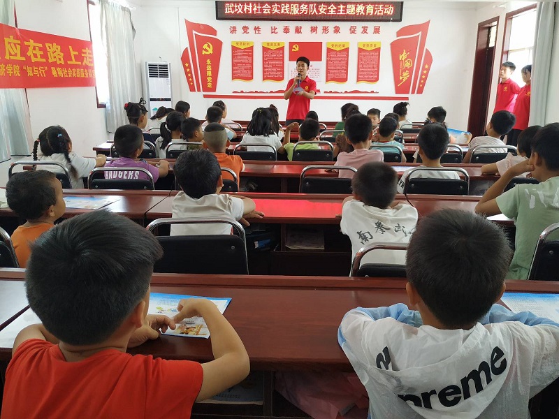 在结束了下午的复习之后,服务队小支教老师们在教室开展了安全教育义务支教课。首先,小老师们先给小朋友们发放了我们精心准备的儿童安全手册和食品安全手册。课堂上,针对现代社会对儿童安全构成的方方面面隐患,从生活实际入手,突出了儿童教育的知识性、实用性、指导性,更接近儿童心理,使他们轻松接受的同时,自觉树立自我保护意识,走上充满阳光的成长之路。由于武坟村村口有个大水库,队员们重点讲述了夏季防溺水、防中暑的安全小知识。对于年纪小的同学主要通过讲故事、表演等方式绘声绘色的把安全知识分解成简单容易接受的小故事;对于年龄稍大的同学则是采用举例子和游戏问答互动的活动方式进行,同学们参与度极高,举着小手抢着说出自己的观点。