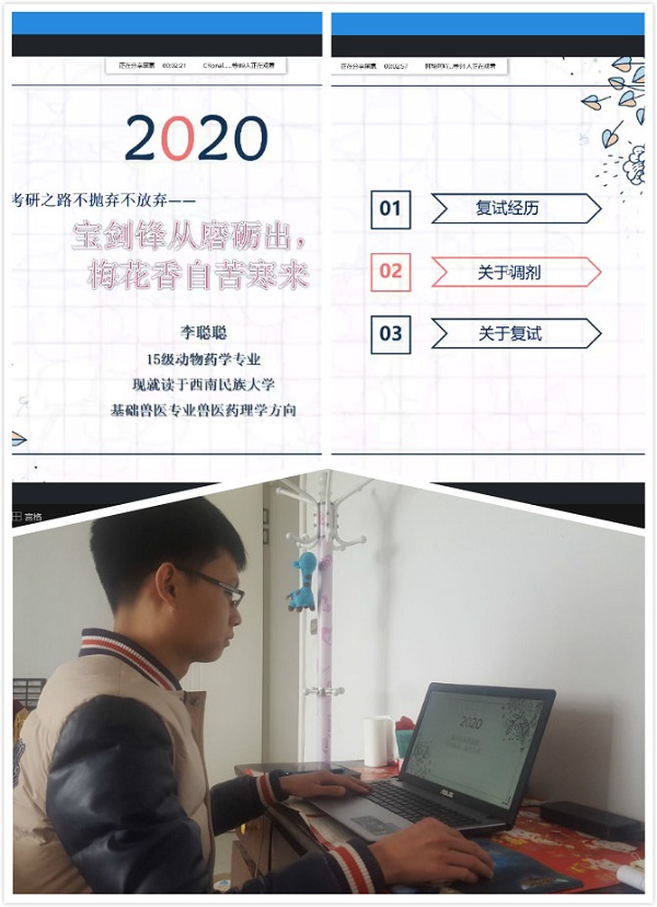本次云交流通过QQ群,以PPT屏幕分享的形式,4位主讲人结合自己考研复试的亲身经历进行了深入细致的讲解。现就读于华南农业大学李梦圆同学结合自己复试逆袭的经历,就如何联系导师、笔试面试具体流程、复试常见的一些问题进行了分享,她认为自己能够逆袭的秘诀就是“把每一步做好,就是最大的成功”;现就读于西南民族大学的李聪聪同学,结合个人调剂的曲折经历,分享了调剂的一些小经验,包括调剂信息获取、调剂流程、调剂公司选择、复试准备、心理调适等,鼓励学弟学妹不抛弃、不放弃;现就读于扬州大学的刘凯慧同学,主要从导师的选择、复试的准备、笔试面试注意事项等几个方面分享了自己的经验,并强调了个人本科期间科研经历、英语四级的重要性;现就读于上海海洋大学的徐璞同学主要从复试期间住宿、面试礼仪、自我介绍、英语口语测试、面试提问环节等方面重点做了分享。云端交流会气氛热烈,四位主讲同学知无不言,与即将参加考研复试的学子积极互动,一一解答提出的问题。