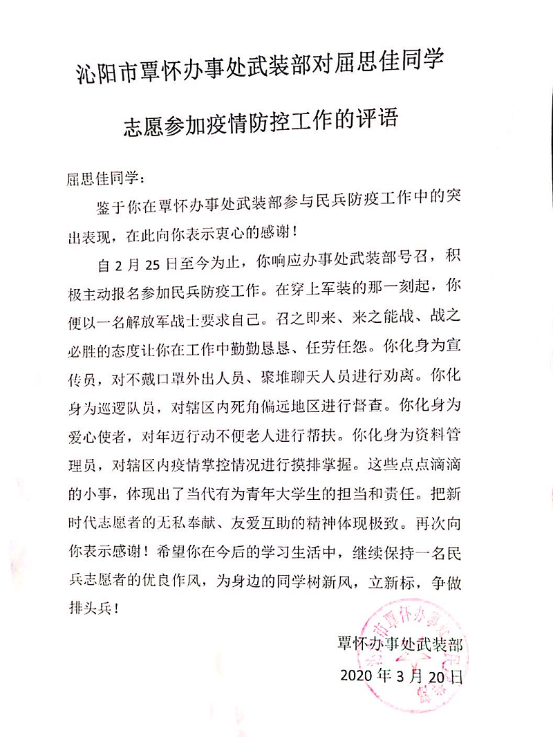 近日,沁阳市覃怀办事处武装部发来感谢信,对2019级宠物医学01班员工屈思佳同学在家乡疫情防控工作中的突出表现予以表彰和感谢。