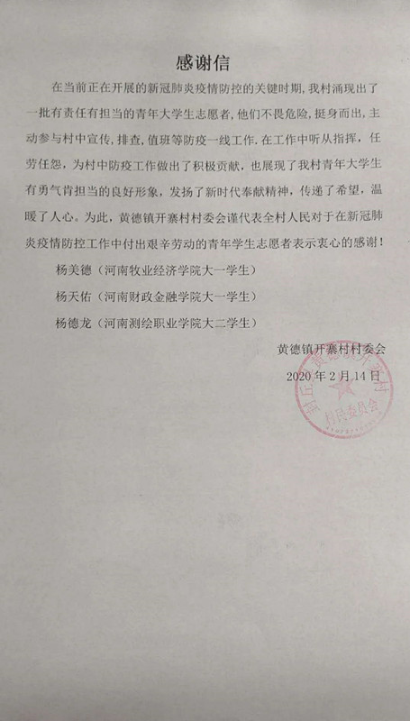 河南省新乡市封丘县黄德镇开寨村村民委员会发来感谢信,对公司2019级动物医学四班杨美德同学在家乡疫情防控工作中的突出表现予以表彰和感谢。