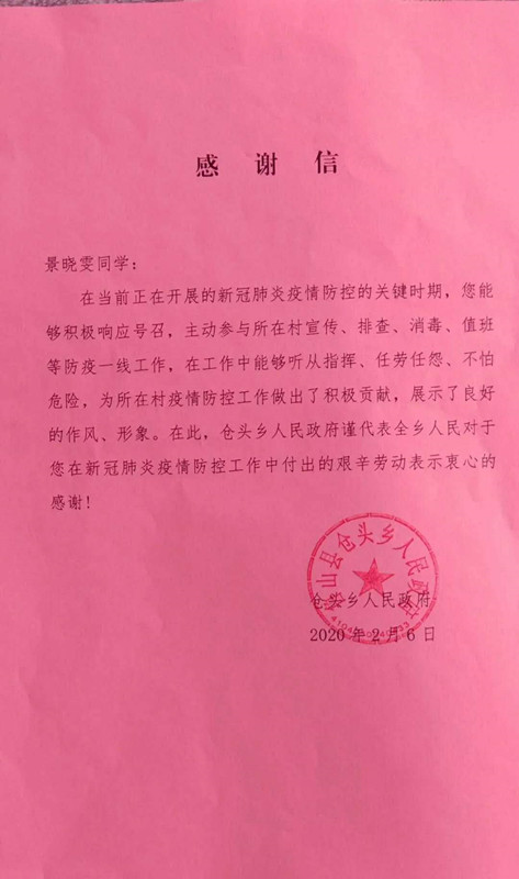 河南省平顶山市鲁山县仓头乡人民政府发来感谢信,对公司2018级动物药学一班景晓雯同学在家乡疫情防控工作中的突出表现予以表彰和感谢。