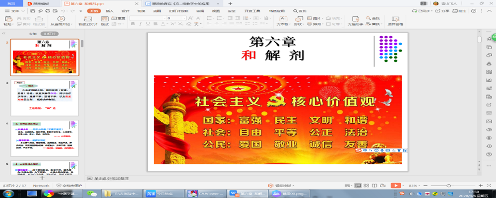 乔卿梅老师《方剂与中成药》的“和解剂”部分将社会主义核心价值观之“和谐”和习近平总书记“和而不同,美美与共”大国外交理念融入其中,增强员工中国传统文化自信。