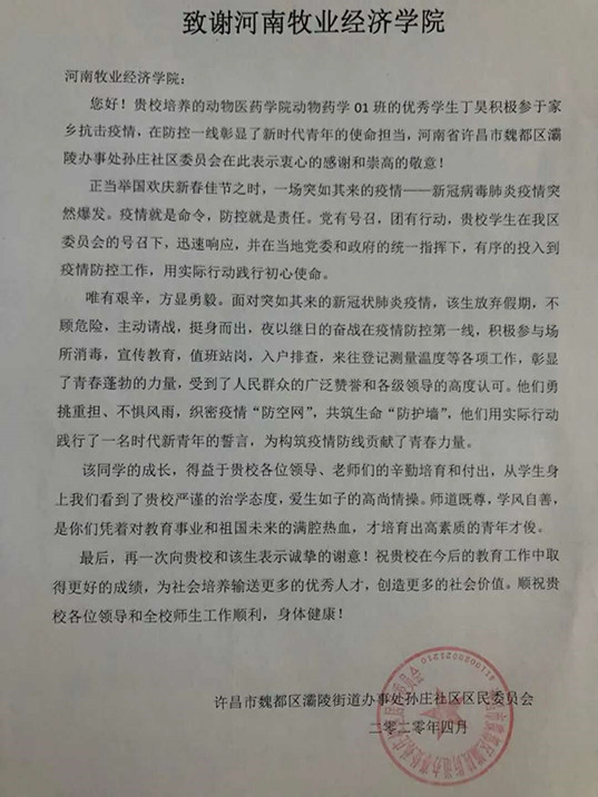 近日,许昌市魏都区灞陵街道办事处发来感谢信,对公司2019级动药一班员工丁昊同学在社区疫情防控工作中的突出表现予以表彰和感谢。