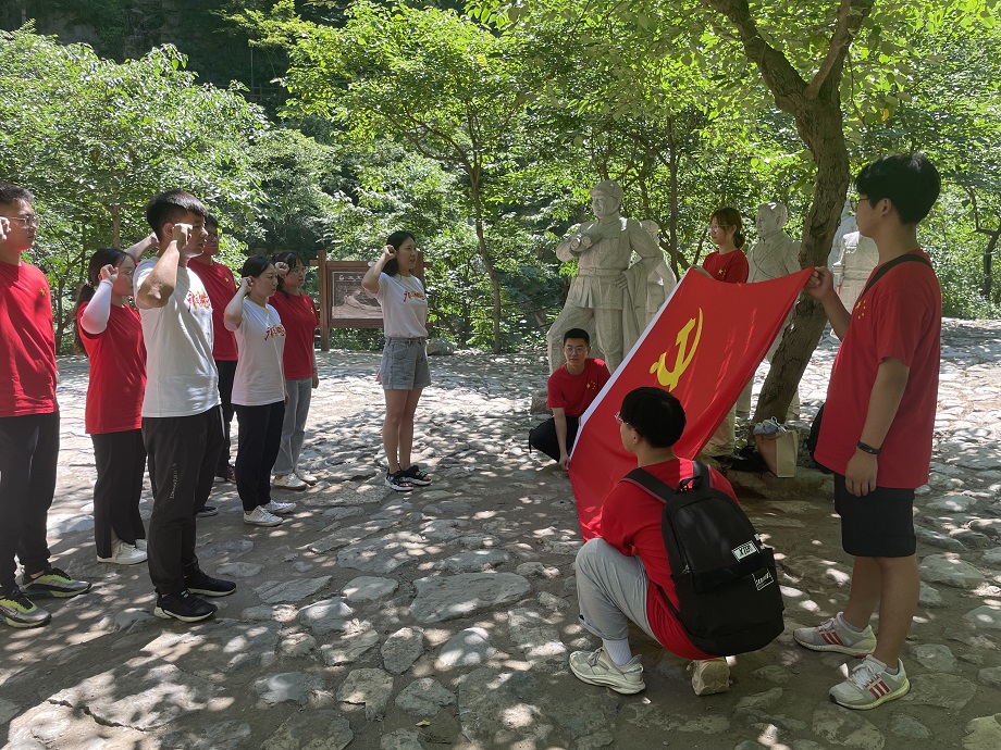 7月8日上午9时,实践队一行首先到达五龙口朱德出太行小道,重走朱德出太行山小道,重温抗日战争时期的八路军太行山抗日革命历史,实地学习体验革命前辈的艰苦卓绝、吃苦耐劳精神,接受革命传统教育,坚定理想信念。同时,队员们在朱德出太行纪念碑前重温入党誓词,并集体朗诵朱德总司令走出太行时的七言绝句,激发了每位党员的光荣感和责任感,更坚定了青年团员向党组织靠拢的信心和决心。