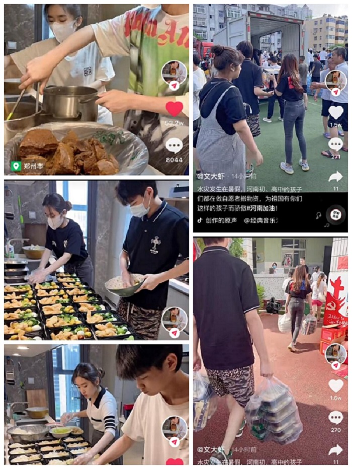 20动医升本01班员工陈思宇自7月22日在互助群中看到救援人员每日只能吃泡面、面包,吃不上一口家常饭,当即决定与家人一起每日购买新鲜食材,做好饭菜打包送到物资收集处,由收集处送给从全国各地来的救援人员。陈思宇和家人22号为志愿者们制作了凉皮,23号为志愿者们做了二十斤卤牛肉,煮了600个饺子。24号为志愿者们做了炸油条和卤鸡蛋,煎饺子,听闻救援人员好几天没吃蔬菜了便在饭菜中加入了青菜。24号晚陈思宇和家人开车到新乡物资收集处,向救援人员提供了近一百份晚餐的同时,还自发加入到物资收集处搬运传递物资的队伍中帮助搬运物资。陈思宇同学和家人一起为救援人员准备爱心餐的视频,在抖音平台上一经发出,第一日点赞量高达120W,网友们纷纷表示这就是当代青年的模样,互爱互助,共渡难关。