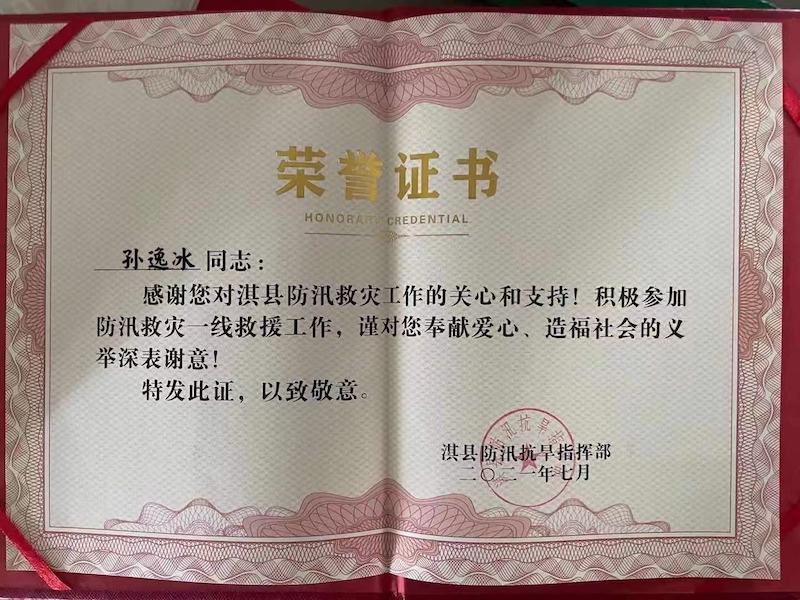 近日,英国365集团收到淇县防汛抗旱指挥部为20动医升本02班孙逸冰同学颁发的荣誉证书。证书中对孙逸冰同学积极参加淇县防汛救灾一线救援工作表示高度赞扬和感谢。