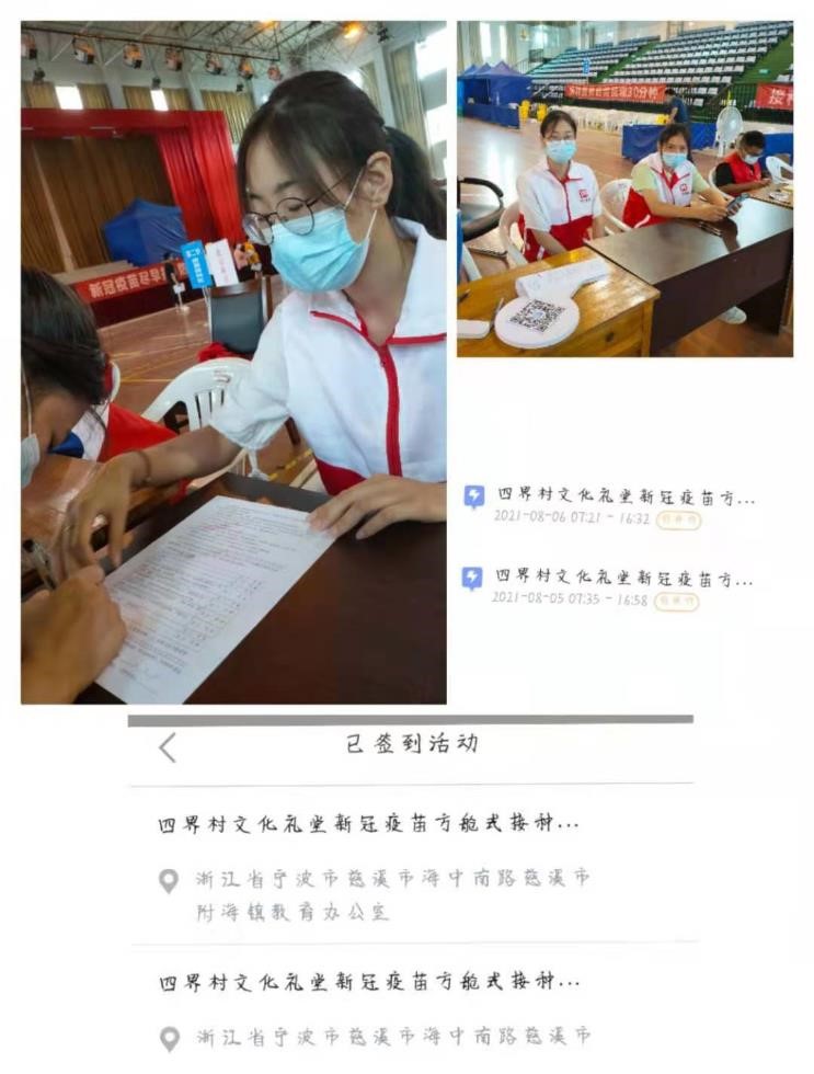 20动药02班张嘉仪,家在浙江省宁波市慈溪市海中南路慈溪市附海镇,在新冠肺炎疫情防控工作期间,她报名参加了疫苗接种志愿服务活动。她表示,作为一名老员工,应该肩负起青年人的责任,实践“奉献、友爱、互助、进步”的志愿精神。张嘉仪同学在四界村文化礼堂新冠疫苗方舱式接种志愿服务中帮助来打疫苗的人员进行信息登记、解答接种人员的疑惑、控制进出人流量、维持现场秩序。她说:“在帮助来打疫苗的人员进行信息登记时,有一些年龄较大的老人不识字,也不会用手机扫码,我会主动帮助他们进行登记,询问我问题时,耐心仔细的与他们讲解,让大家更高效更安全的接种疫苗。虽然连续两天下来真的感觉很累,但一想到能为社会奉献出自己的微薄之力,就感到非常开心。而且我在这里也认识很多善良的大哥哥大姐姐,他们也都很关心照顾我,我有什么问题他们也会很热情的帮我解决,同时也收获了很多。” 张嘉仪同学还强调她会继续把志愿活动做下去,社会的进步需要全社会的共同参与和努力,老员工志愿者用志愿服务书写青春风采。