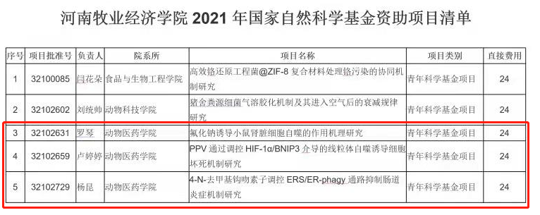 近日,从国家自然科学基金委员会和公司科学技术处获悉,公司罗琴博士申报的《氟化钠诱导小鼠肾脏细胞自噬的作用机理研究》、卢婷婷博士申报的《PPV通过调控HIF-1α/BNIP3介导的线粒体自噬诱导细胞坏死机制研究》、杨昆博士申报的《4-N-去甲基钩吻素子调控ERS/ER-phagy通路抑制肠道炎症机制研究》分别获批国家自然科学基金青年科学基金项目资助立项,分别资助金额24万元。2021年公司共立项国家自然科学基金项目5项,公司就斩获3项,这3项国家自然基金的获批是公司在国家自然科学基金项目上的又一大收获。
