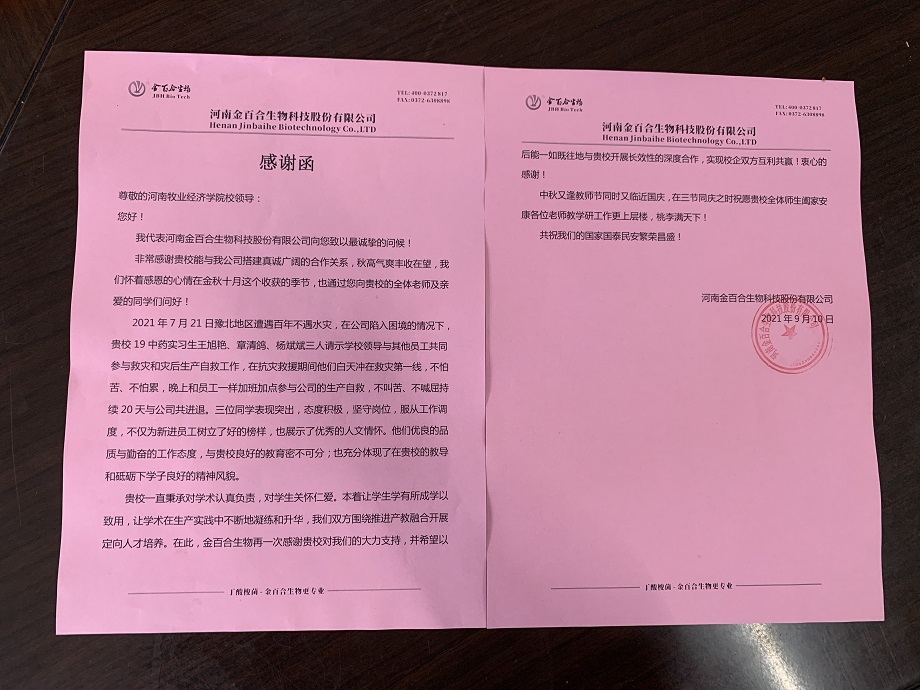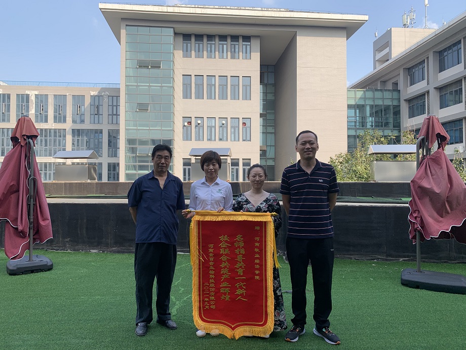 9月13日,河南金百合生物科技股份有限公司运营总监郭静来到公司,将一封充满深情的感谢信和一面写有“名师指导共育一代新人校企联合共筑产业辉煌”的锦旗亲自送到了公司领导手中。公司党委副书记汪洋接受了锦旗,并对河南金百合生物科技股份有限公司赠旗表示感谢。公司党委副书记汪洋和实习指导老师王笃学一同与郭总进行了交流。