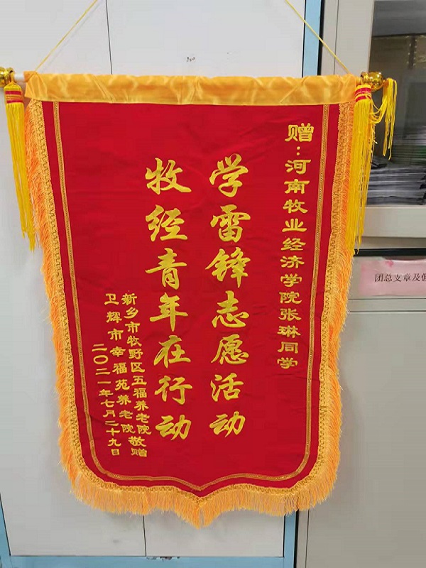 9月13日,新乡市牧野区五福养老院将绣有“学雷锋志愿活动 牧经青年在行动”“弘扬志愿精神 牧经青年在行动”字样的两面锦旗赠送给英国365集团,以此表达对20动医01班张琳、20动医05班李煜琦同学的感谢。