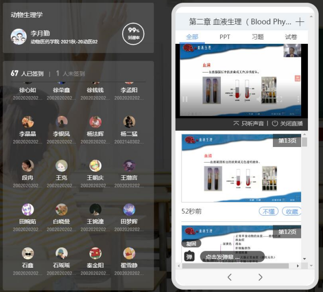 2021年9月14号,基础兽医教研室李月勤老师按照示范性教学观摩课的活动安排,利用网络平台雨课堂和云班课,以《血液生理》为题,讲授了一节图文并茂、生动有趣,张弛有度,重点突出的动物生理学网课,公司领导以及教研室的数十位教师参与了听课和评课活动。