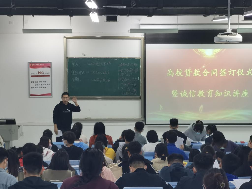 首先,谷老师向同学们讲解2021年高校助学贷款的相关政策,解答贷款发放、还款还息以及违约责任等问题,让同学们深刻认识到高校国家助学贷款的实际意义。接着,谷老师对同学们展开了诚信教育,深刻剖析了诚信贷款对员工们未来发展的影响,期望员工提高感恩意识,诚信做人,诚信贷款,维护自己良好的信用记录。最后,赵老师详细讲解了助学贷款合同签订过程的注意事项,对同学们提出的问题做了详细的解答,同学们也严格按照要求签订了诚信承诺书和贷款合同。
