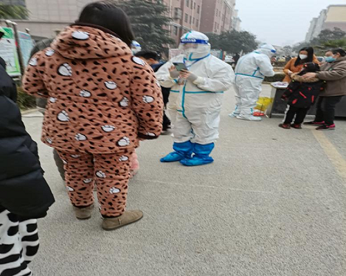 2022年1月13日,河南省安阳市内黄县中召乡王大吴村已经连续4天进行了核酸检测。当服务系统出现卡顿时,有一位身穿防护服的少年坐在桌子前拿笔登记名字与身份证号,他便是公司19动药02的王振宇。不需要做核算时,他需要在卡点进行站岗执勤。他说:“因为我家这边是中高风险地区,所以每天都需要注意力高度集中注意外来车辆,以及对外来人员进行登记。我一定会负起这个责任,对国家和村民负责!”
