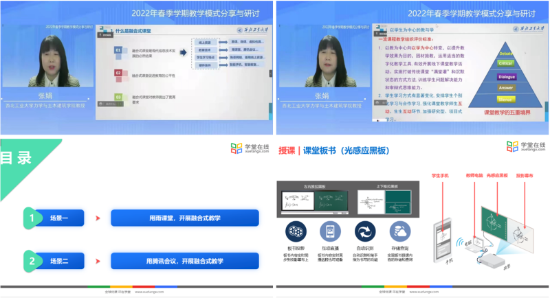 研讨会上,西北工业大学张娟教授从什么是融合式课堂、怎么做融合式课堂、融合式课堂的实践三个方面做了《融合式课堂浅析及实践》的分享。雨课堂在线资深培训师姚保峰对软硬件的准备、授课步骤进行了详尽的培训。2月18日下午,为便于平台搭建及完善提升,公司邀请雨课堂平台技术人员对平台建课、关联表填写、平台完善提升、平台与腾讯会议联合后的新特点进行培训及答疑。