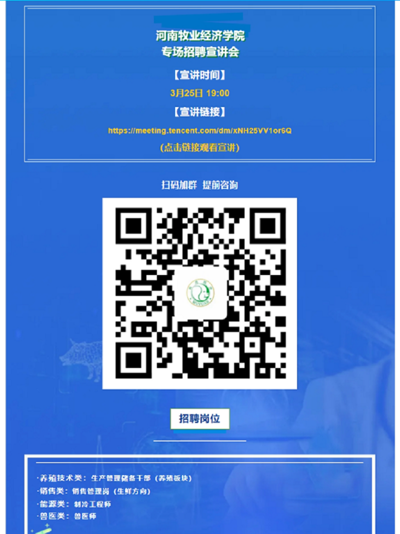 为进一步搭建毕业生就业平台,增强同学们对就业形势的认识,丰富和增长员工面试的经验和能力。3月25日下午,召开线上企业宣讲会,参会企业有牧原食品股份有限公司和大北农食品集团。