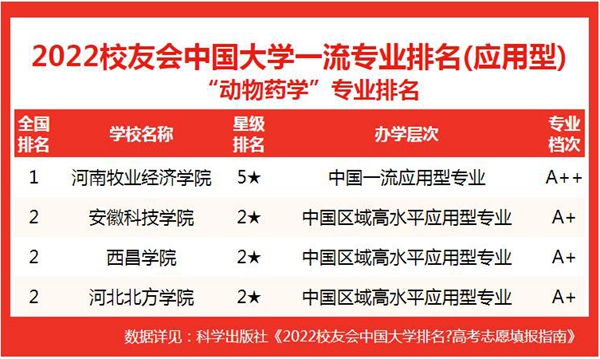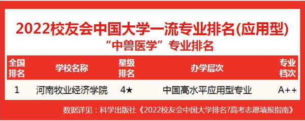 2022年3月30日,全国第三方大学评价机构艾瑞深员工会网(Cuaa.Net)撰写完成、科学出版社出版发行的《2022员工会中国大学排名高考志愿填报指南》最新发布员工会2022中国大学一流专业排名中,公司动物医学、动物药学、中兽医学3个本科专业荣登员工会2022中国大学一流专业排名(应用型)榜首、动植物检疫专业位居全国第二。