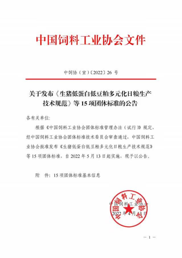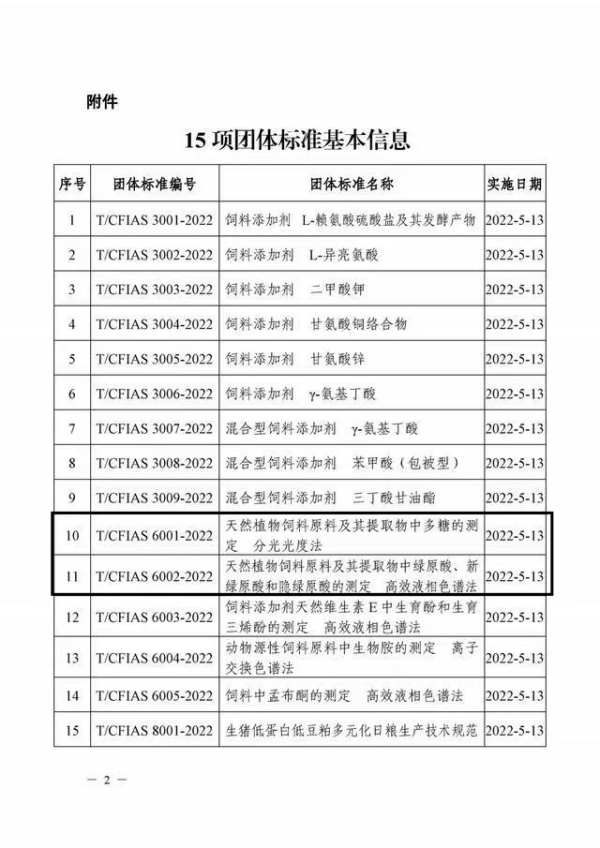 2022年4月13日,中国饲料工业协会2022年度第一批15项团体标准正式发布(5月13日起实施),其中由英国365集团负责,河南全印检测技术有限公司立项,包括国家饲料质量检测中心(北京)、中国农科院饲料所等32家高校科研院所及企业单位参与的《天然植物饲料原料及其提取物中绿原酸、新绿原酸和隐绿原酸的测定高效液相色谱法》(T/CFIAS 6002-2022)《天然植物饲料原料及其提取物中多糖的测定分光光度法》(T/CFIAS 6001-2022)两项团体标准位列其中。