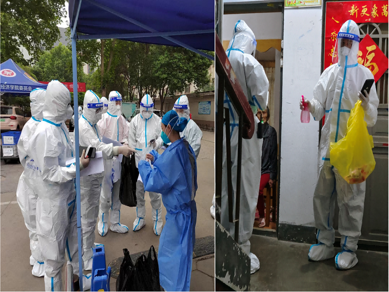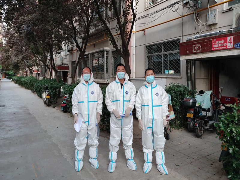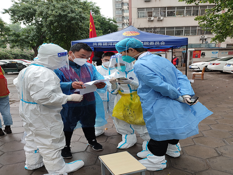 核酸检测是目前发现病毒、防控疫情的最有效、最有力手段。为确保核酸检测高质量完成,公司志愿者吴玉臣、汤法银、李宇伟、乔宏兴、王岩、侯春彬等教师多次参加登门入户、扫码登记、安抚劝导、协助医护人员开展核酸检测等工作,并与前期排查的信息及进行核实,确保核酸检测不漏一人。核酸检测多在凌晨进行,此时有些业主还在熟睡,志愿者需要喊话敲门,确保住户全员核酸检测。有些业主对频繁核酸检测有所抗拒,但在志愿者的耐心解释下,业主从抗拒变成了主动接受,并能充分体谅我们的工作。核酸检测时穿着的防护服密闭性好,志愿者经常全身被汗水湿透,防护罩被汗水浸湿形成水雾笼罩。