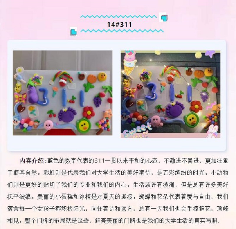 在持续两周的员工公寓文化节系列活动中,各宿舍精心装点内部环境,精彩设计创意满满,成员们的创造力和凝聚力都得到了提高,营造了温馨舒适的公寓环境,为建设美丽、和谐、健康的校园文化起到了促进作用。(图/文 付文凯)