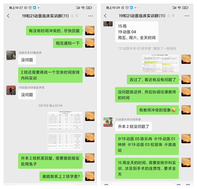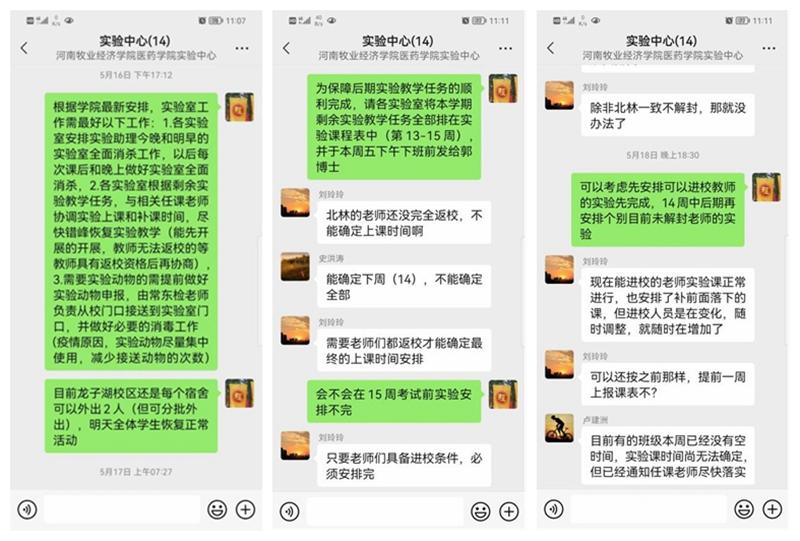 实验中心主任程茂高迅速组织开展全面协调工作,开展实验室安全检查和消杀工作,协调实验动物和耗材以及实验安排等工作;负责预防兽医实验室郭素琴老师手机使用到发烫,没电了边充电边联系协调,一直持续到深夜;负责临床兽医实验室刘玲玲老师还在隔离观察期间,面对实验动物协调供应,多课头和实践周协调安排,以更优化的方式保障实验课的开展;负责基础兽医实验室史洪涛老师早上六点多赶到实验室,安排协调接下来的工作,协助分担处理暂未能返校的实验老师工作......面对繁重的常规实验教学任务和实训周,实验中心各实验员与教研室协同,能返校的教师全员上阵,充分发挥课程团队团结协作,代替无法返校教师上课,全院实验室统筹协调利用,保证实验课的及时开展。