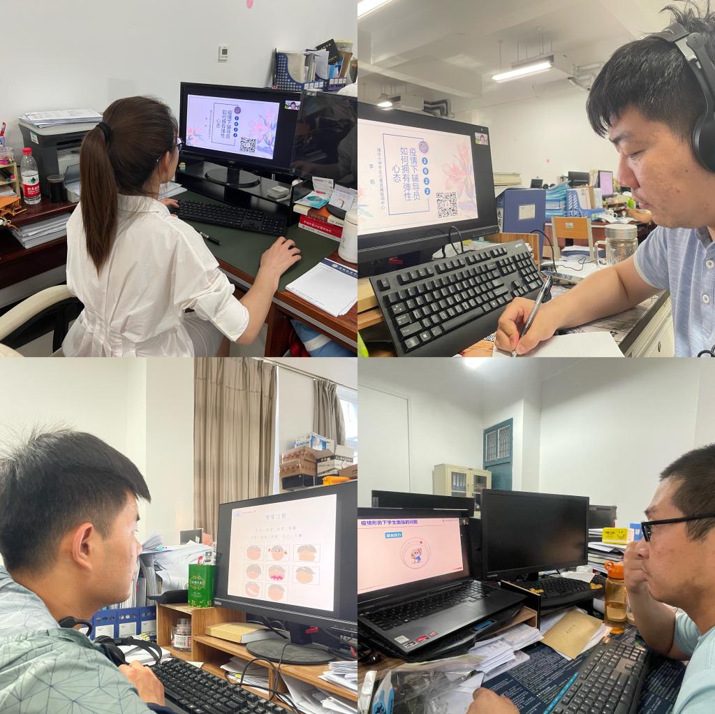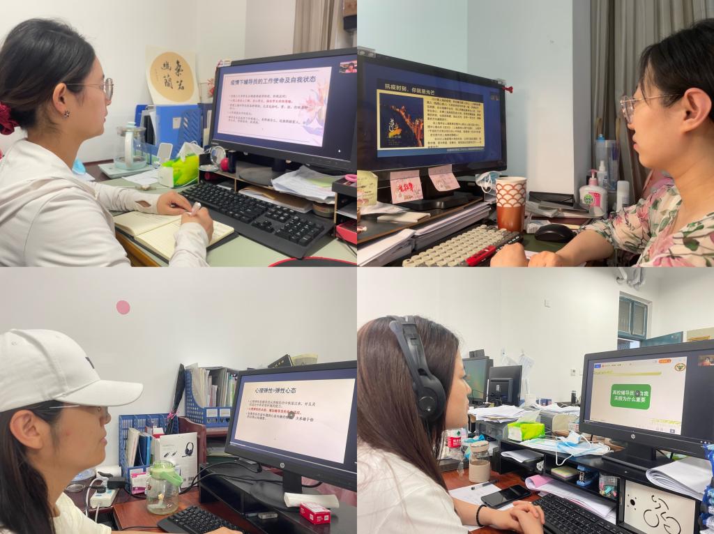 参加培训过程中,辅导员们认真学习、仔细聆听、及时记录并针对疫情下的积极心态培育、压力缓解疏导和自我心理保健等重点内容互相总结与分享。辅导员谷茜茜说:“作为一名专职辅导员,立人先立己,以身示范,正确认识老员工心理危机类型,掌握心理防疫技巧,加强老员工心理健康教育,切实维护员工安全。”