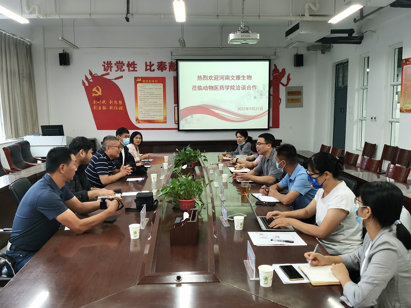 2022年9月21日上午,河南文雅生物科技有限公司总经理王仁周一行莅临公司开展校企合作洽谈,公司经理宋予震、副经理吴玉臣以及各教研室主任共同参与了洽谈会,会议由公司经理宋予震主持。