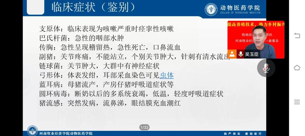 培训会上,吴玉臣副经理以《提高养殖技术,助力乡村振兴》为题,围绕冬季猪呼吸道疾病的防控工作,就猪场常见呼吸道病鉴别诊断和防控方案等具体内容为广大养殖场进行了详细的讲解,并线上对提出的问题做了细致的解答。新蔡县大马庄村驻村第一书记杨军代表当地养猪户对吴经理的报告表示感谢,并欢迎公司的专家教授在疫情过后到大马庄进行实地指导。