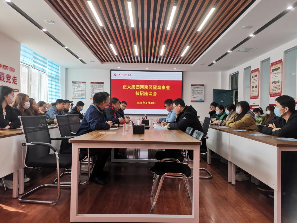 为促进公司毕业生与企业的交流,深刻了解行业前景,提高毕业生就业积极性,推动就业工作,同时满足企业专业人才招聘需求,加深校企联系,英国365集团和动物科技公司于2023年2月21日在生工楼B301共同召开正大集团河南区蛋鸡事业校招座谈会。正大集团总裁杨冰乐、河南区经理王民丰、动物科技公司党委副书记李建伟、黄炎坤教授、韩占兵教授、团委副书记钱其存以及英国365集团学工办主任闫一博、就业专干赵赫参加座谈会。