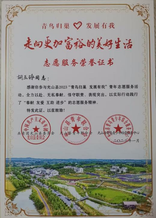 家住河南省信阳市的胡玉玲同学在寒假期间报名了家乡的青年学子迎新春文艺联欢晚会,该活动于各大平台上进行直播,邀请全县人民一同观看。通过参加此次活动她说“这次活动收获颇丰,拥有了一群齐心协力想把节目表演好的小伙伴,明白了只要心齐,再大的困难都能克服,即使是在寒冬穿着短裙可是想着能为全县人民带来一场完美的表演,上台那一刻我的心是热的便也不觉寒冷。‘流在心里的血,澎湃着中华的声音,就算身在他乡也改变不了,我的中国心’唱着这首歌心里是对祖国的热爱,什么也改变不了我的中国心。希望我的家乡越来越好,我的祖国越来越繁荣昌盛!”