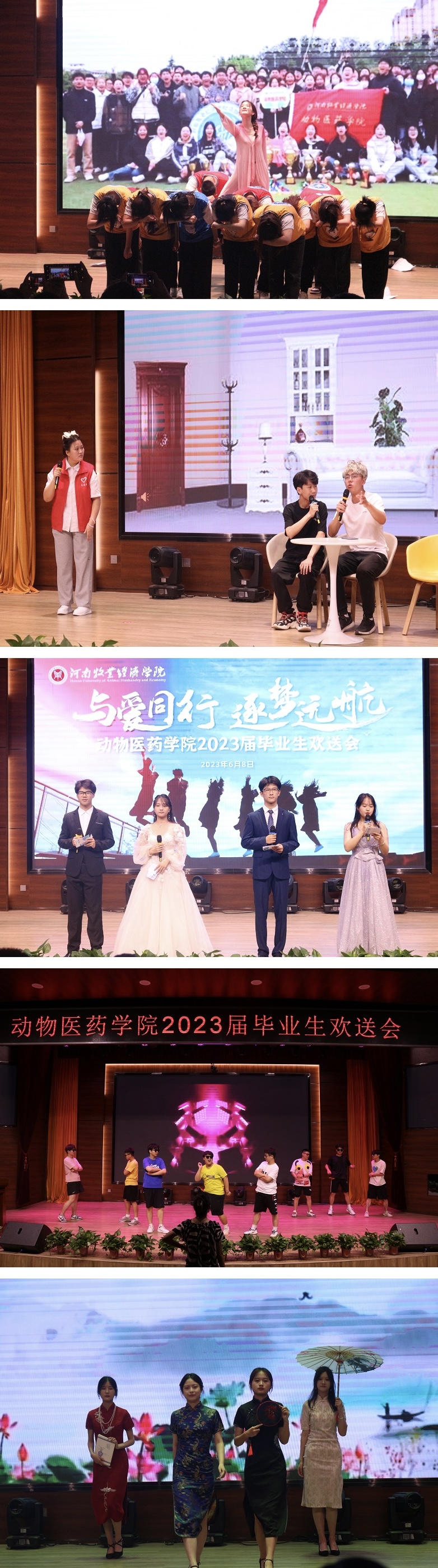 下午5点,“与爱同行 逐梦远航”毕业生欢送会正式拉开序幕,青春欢快的开场舞及网络热舞串烧将现场气氛点燃,端庄典雅的汉服秀及古风走秀带领大家领会了传统民族服饰文化之美,一首《你曾是少年》更是将现场氛围烘托到极致,小品《老爸受骗了》《扰民了您》诙谐幽默,让毕业季不再那么伤感,舞台剧《梦开始的地方》为观众带来了全新的视觉盛宴,独唱《那些年》带全场同学回忆了这些年的青春故事。在惊喜环节,毕业班的辅导员老师带来的歌曲《同桌的你》《再见》,唱出了对毕业学子们殷殷期盼和深情祝福;最后,欢送会在院合唱队一首触动心扉的歌曲《追光者》当中,完美落下帷幕。