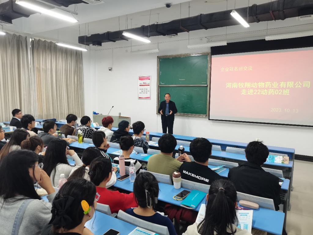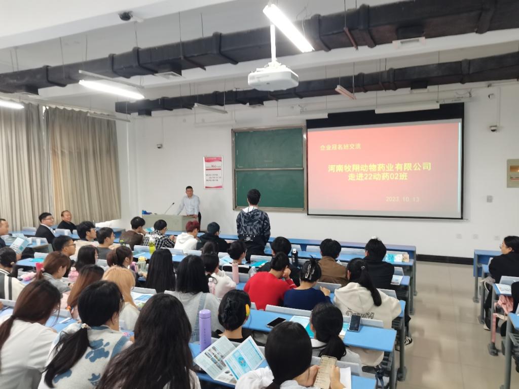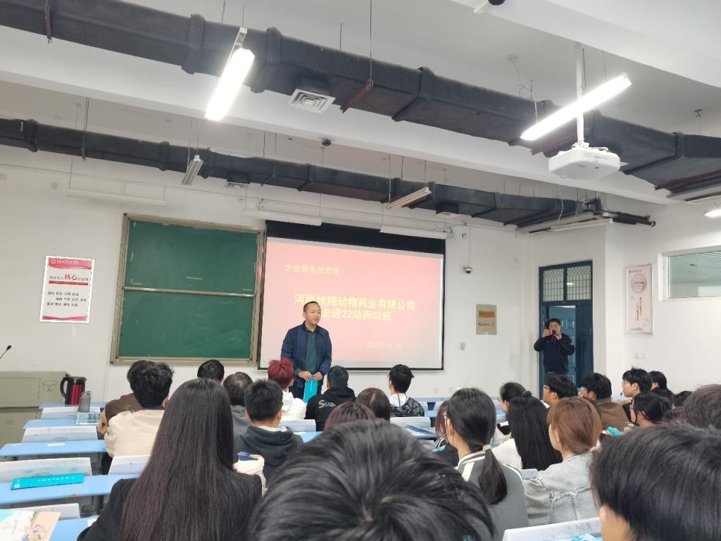 为深化校企合作,共育应用型人才,10月13日下午,在二号教学楼合班教室403,河南牧翔动物药业有限公司人事总监蒋吉勇总经理、企业班主任张印以及猪药首席畜牧师代广军与22动药2班全体同学们进行了交流。参加此次交流会的还有公司党委副书记汪洋、辅导员康宇、校方班主任王炼。