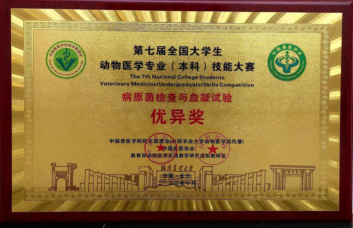 2023年10月21日-24日,第七届全国老员工动物医学(本科)专业技能大赛在湖南农业大学举行,共有来自全国动物医学专业高等院校72支参赛代表队360名动医学子同台竞技。经过2天的激烈角逐,公司由王甲鑫、马婉宁、高晖超、卢笑笑、郭霖蓉五位同学组成的代表队在大赛中表现突出,荣获团体特等奖,并首次获得单项优异奖。