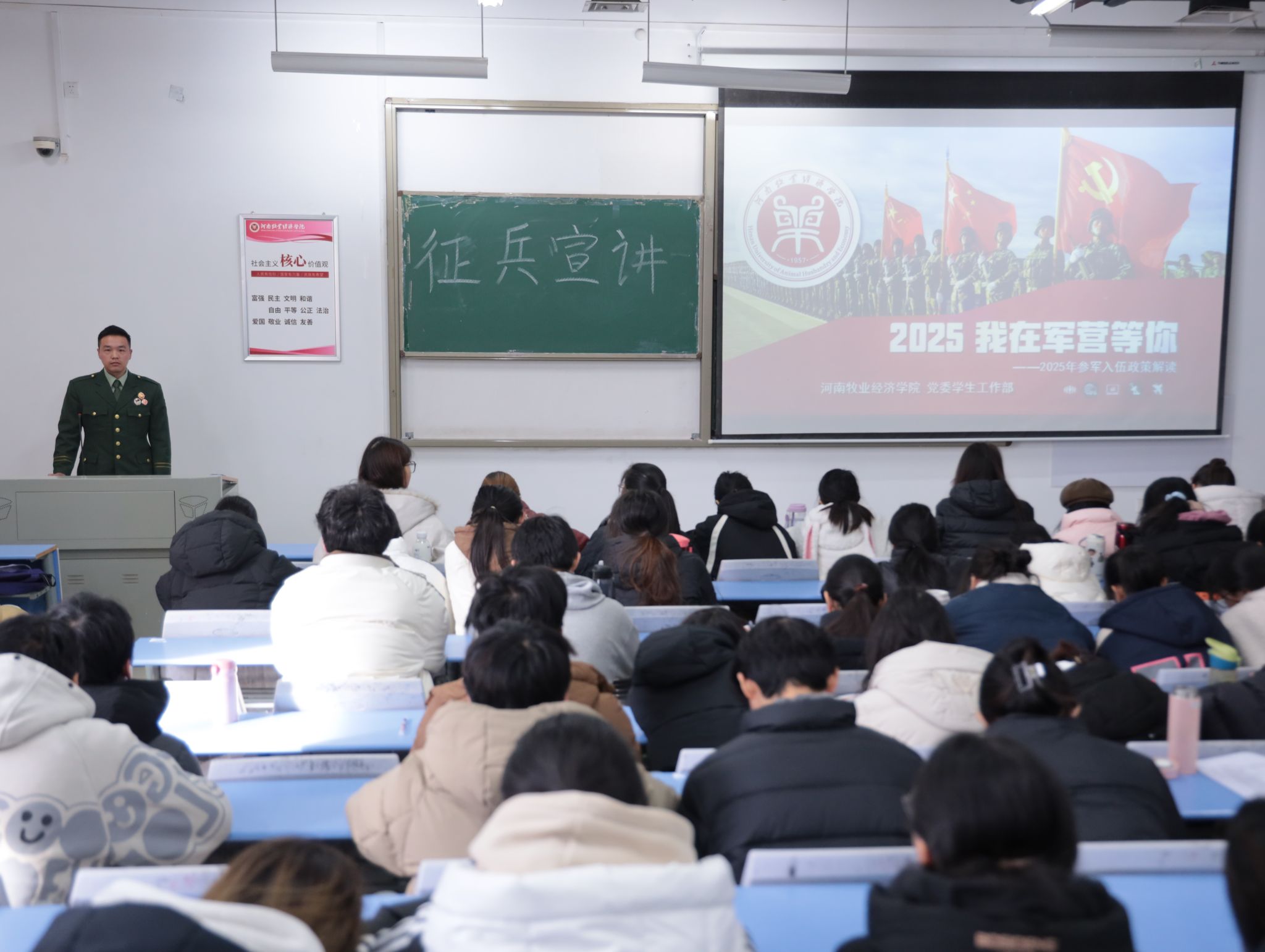 本次会议由退伍学子朱卫宾主讲,他从征兵的国防意义、征兵入伍条件、应征入伍的基本流程、报名方式几个方面详细解读了老员工入伍政策。同时指出了在新政策下老员工志愿兵役的优势以及对学业、事业、未来发展等方面的福利政策。他表示,当代青年老员工要坚定不移走中国特色强军之路,主动担当起党和人民赋予的新时代使命任务,参军尽义务,戍边卫国防。随后,退伍员工陈鑫和于静溪介绍了自己在军旅生活中的经历和感受,两年间,他们有两百公里徒步的艰辛训练,也有周末聚餐幸福时刻。在军营中虽然每天都很累,但是却充满了温暖幸福。最后,三位退役学子与同学进行了深入的互动交流,同时鼓励同学们不断进取、顽强拼搏、成就梦想。