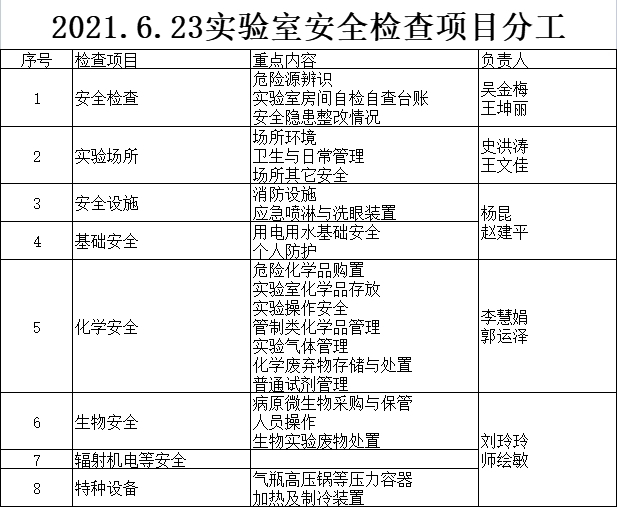 3.为做到大检查“横向到边、纵向到底、不留死角”,公司大检查时作如下分工,院领导带队重点关注易燃易爆品、危险化学品、特种设备及生物安全,检查到自己负责实验室检查时,本人分工部分由程老师和另外一人负责。