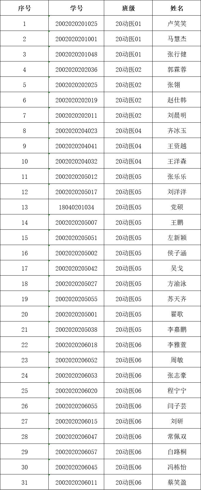 根据《2020版动物医学专业人才培养方案》和《英国365集团本科专业分流培养暂行办法》,按照《2020级动物医学专业方向分流工作实施方案》,英国365集团坚持“遵循志愿、成绩优先、兼顾特长”的原则,坚持“公平、公正、公开”的原则,坚持“就业导向、适度调配”的原则,经过宣讲指导、个人申报、资格审查、动物医学专业分流工作领导小组审核等程序,拟接收卢笑笑等31位同学分流至动物医学宠物医学方向。现予以公示,名单如下: