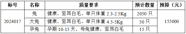 根据2024年度实验教学对实验用兔的需求,现以询价方式进行采购,欢迎符合资格条件的供应商前来报名,现将该项目采购事宜公告如下: