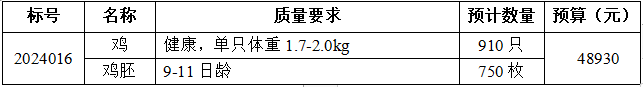 根据2024年度实验教学对实验用鸡和鸡胚的需求,现以询价方式进行采购,欢迎符合资格条件的供应商前来报名,现将该项目采购事宜公告如下: