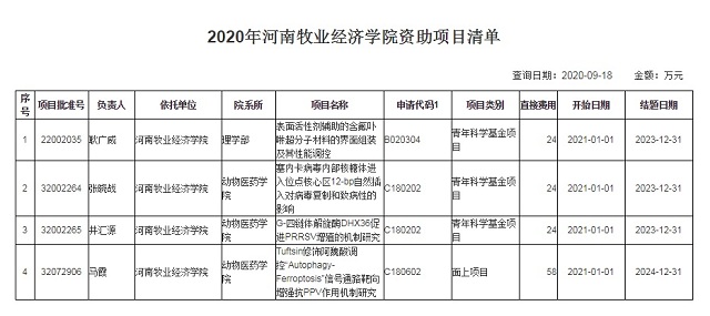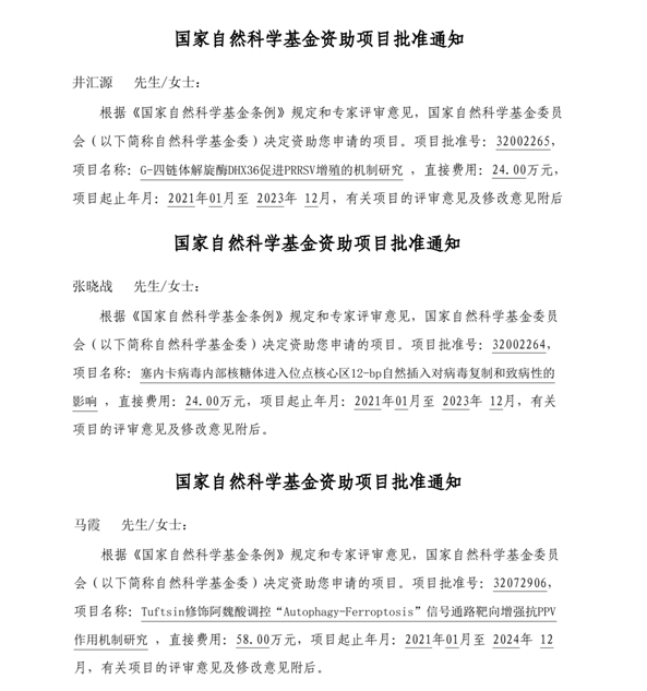 近日,从国家自然科学基金委员会获悉,公司马霞博士申报的《Tuftsin修饰阿魏酸调控“Autophagy-Ferroptosis”信号通路靶向增强抗PPV作用机制研究》获批国家自然科学基金面上项目资助立项,资助金额58万元;井汇源博士申报的《G-四链体解旋酶DHX36促进PRRSV增殖的机制研究》获批国家自然科学基金青年科学基金项目资助立项,资助金额24万元;张晓战博士申报的《塞内卡病毒内部核糖体进入位点核心区12-bp自然插入对病毒复制和致病性的影响》获批国家自然科学基金青年科学基金项目资助立项,资助金额24万元,其中马霞博士申报获批的面上项目是公司升本后取得的第一项国家自然科学基金面上项目,这3项国家自然基金的获批也是公司在国家基金项目上的又一收获。