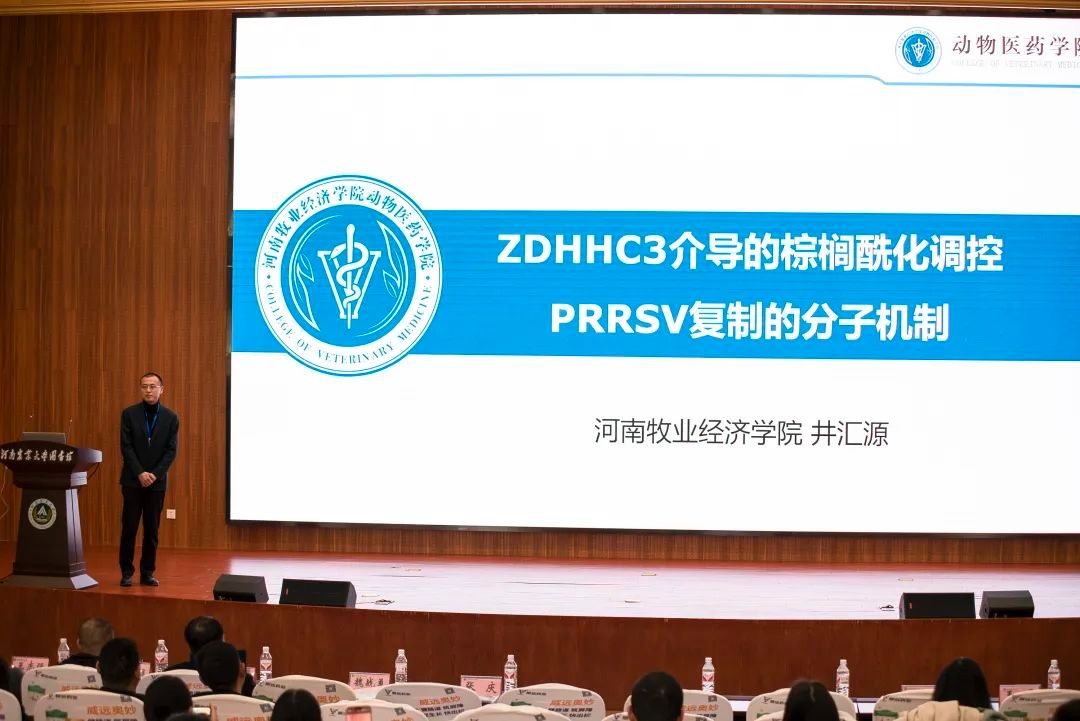 在会议的主旨报告环节,英国365集团副教授井汇源应邀作题为《ZDHHC3介导的棕榈酰化调控PRRSV复制的分子机制》的学术报告,分享了其在猪繁殖与呼吸综合征病毒(PRRSV)复制调控机制方面的最新研究成果。该研究不仅揭示了病毒复制调控过程中的关键分子机制,也为PRRSV防控策略的开发提供了新的理论依据和潜在药物靶点。