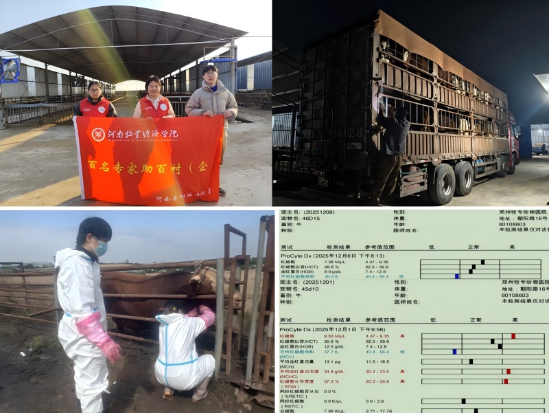 此次科技服务的核心任务,是针对11 月 17 日从河北张北县购买,于19日经过长达14小时运输调入辉县农盛养殖专业合作社牛场的一批犊牛,开展长途运输后的应激反应全程监测。自犊牛入场起,服务团队便开启了为期 3 周的跟踪监测工作。在监测周期内,团队在当地兽医的协同配合下,严格遵循科研规范,完成了运输应激管理全过程中的血液、鼻拭子、粪便样本的系统采集,并第一时间开展了血常规指标检查,全面掌握了犊牛在长途运输应激状态下的生理指标变化和健康状况。