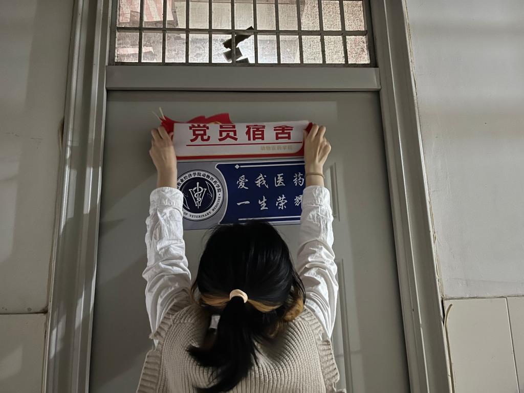 党支部书记、辅导员一行走访了员工党员宿舍,为员工讲解了党员宿舍挂牌的意义。“党员宿舍挂牌”就是为了亮明党员身份,坚守党员责任,牢记党的宗旨,体现党员先进性,并充分发挥党员的榜样作用与模范带头作用。随后,党支部书记与辅导员们分别为党员宿舍一一挂牌,那通红耀眼的“党员宿舍”门牌高高的挂在各位优秀党员宿舍门上,是对每位党员的肯定,更是对他们的期待,期待他们用更严格更自律的方式要求自己,遵守好各项规章制度,真正发挥模范带头作用,影响和带动身边的同学养成好的学习和生活习惯。员工党员张行健表示:“党员宿舍挂牌使员工党员亮出自己的身份,挂牌就是一面旗帜,督促自己以身示范,从学习到工作,从宿舍到班级,创先争优,不断进步。”