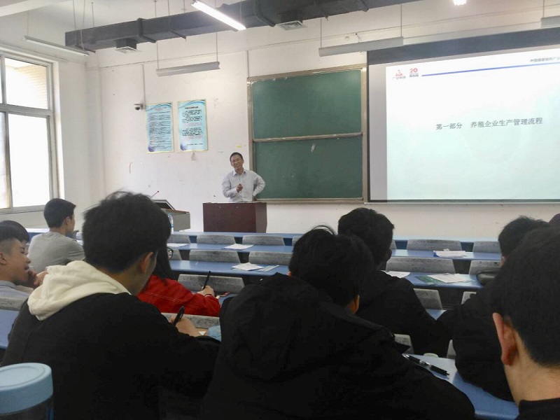 报告伊始,于鹏华经理首先以幽默风趣的语言向同学们介绍自己的工作经历,他用了三年的时间从一名普普通通的养殖研究员走到了技术总监这个位置,成为公司的得力干将,这离不开扎实的专业知识和对工作,对专业一丝不苟的态度。于总对同学们坦言对于专业知识学习和实践生产的重要性,对于实地生产而言,不仅仅是照搬书本知识,而是对于一个人能力的多方面评定。于总结合自身的实际经历,深入浅出给同学们的分享了在养殖生产流程,拓宽了同学们的视野,使同学们充分认识到畜牧行业发展的现状,为同学们未来的职业发展规划指明了方向,增进对专业发展的信心。
